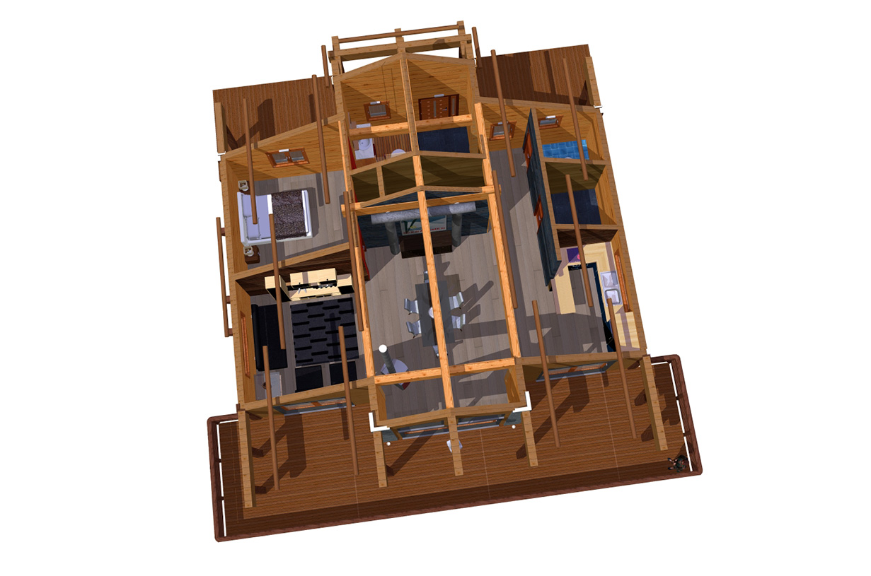 Le chalet a été conçu pour suivre la pente du terrain. Ainsi, les pièces principales se situent sur le niveau supérieur de la maison.